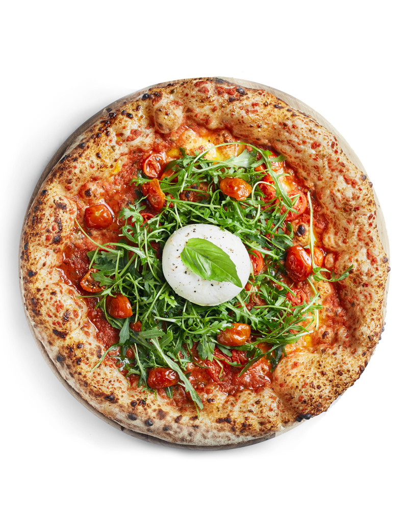Sauce tomate, burrata, tomates cerises, roquette, basilic, huile d'olive extra vierge