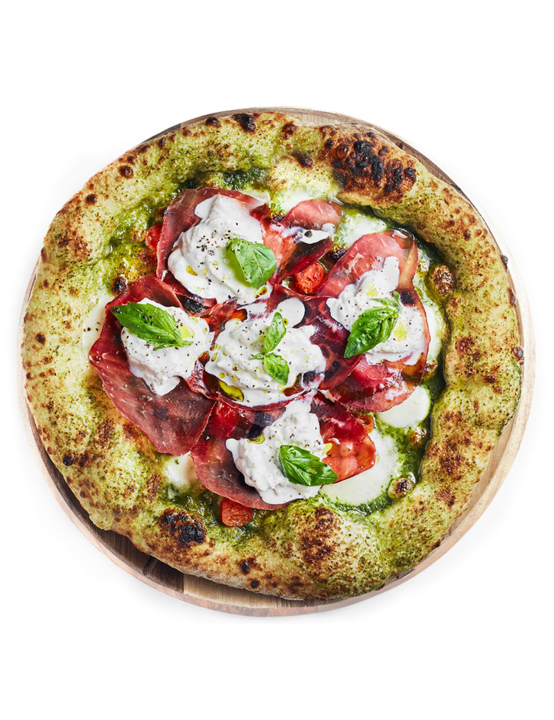 Base Pesto, tomates cerises, jambon cuit, oignons, origan, bufala frais, huile extra vierge