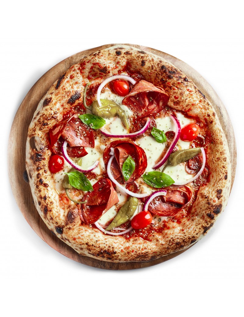 Sauce tomate, mozza, chorizo de boeuf, merguez du boucher, oignons rouges et jalapenos