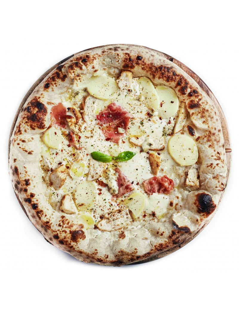 Crème fraîche, mozza, émincés de poulet mariné, jambon de dinde, pomme de terre et fromage bleu