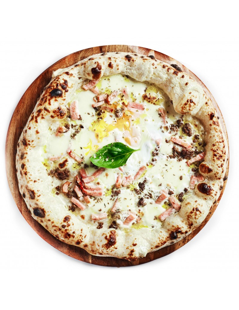 Crème fraîche, mozzarella, viande de boeuf hachée, champignon frais, lardons de veau et oeuf