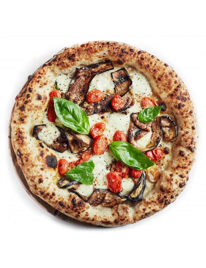 Base caviar d'aubergine, mozza, aubergine grillées, grana padano, olives noires, basilic frais, filet d'huile d'olive