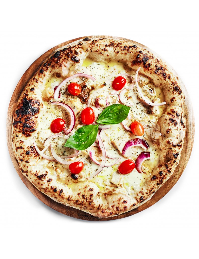 Base moutarde au miel, mozzarella, émincés de poulet mariné, comté, beaufort et oignons rouges.