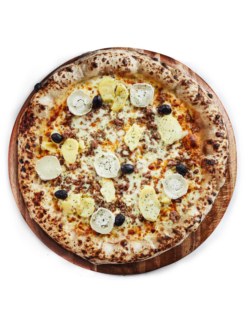 Crème fraiche, mozza, pommes de terre, chèvre et viande de bœuf hachée